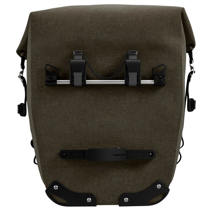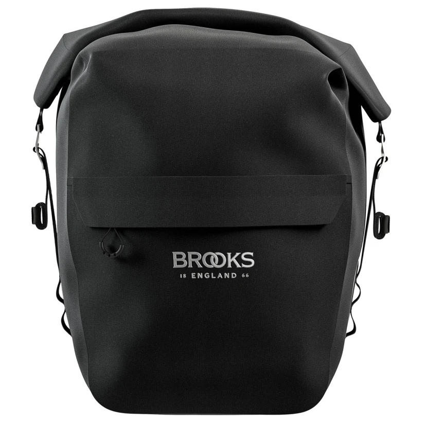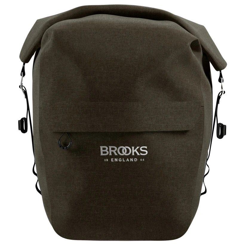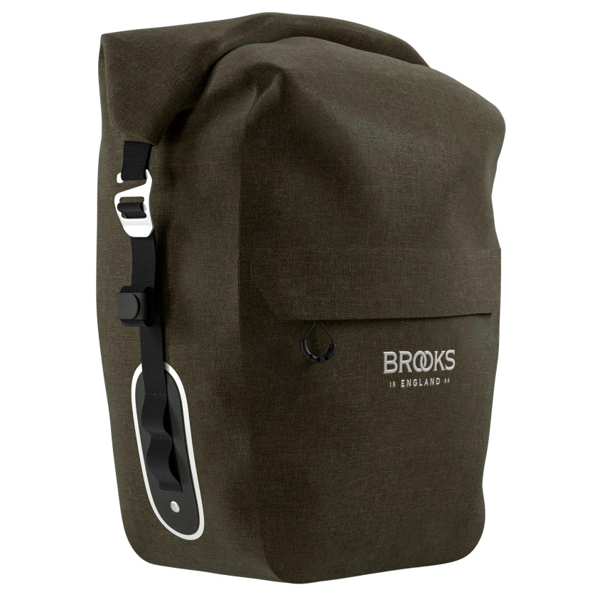 Viel Platz und absolut wasserdicht: die Scape Pannier Large von Brooks England hält das Radtouren-Gepäck trocken! Die Gepäckträgertasche ist aus einem robusten, absolut wasserdichten Kunstfasergewebe mit verschweißten Nähten gefertigt und passt per Klick Fix Aluminium-Halterung auf jeden gängigen Gepäckträger. Die Tasche bietet bis zu 22 Liter Stauraum, ist im Packvolumen per Klett-Straps im Innenraum modulierbar, kommt mit praktischem Rollverschluss und wird durch eine Zip-Außentasche mit Flap ergänzt. Hypalon Straps an den Seiten und reflektierende Details machen die Tasche komplett.