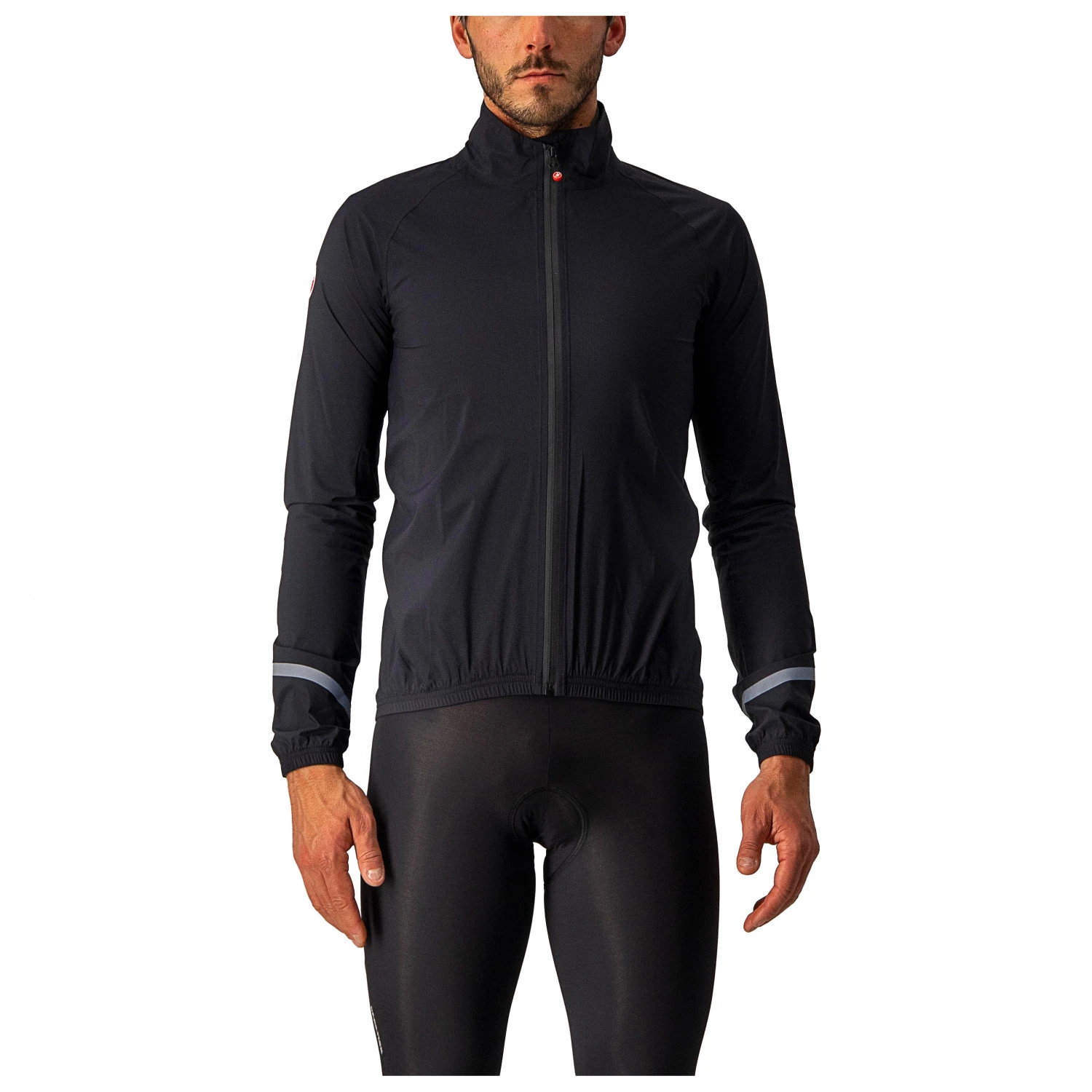 Die Emergency 2 Rain Jacket von Castelli ist eine Jacke zum Immer-dabei-haben. Sie lässt sich in der eigenen Innentasche kompakt verstauen. Dadurch nimmt sie wenig Platz weg und ist in wenigen Sekunden Einsatzbereit. Wenn es unterwegs also mal nass oder windig werden sollte, schützt die Jacke dank der 2,5-Lagen-Technologie zuverlässig vor den Elementen. Der verlängerte Rücken schützt bei einer sportlichen Sitzposition auf dem Rad vor hochspritzendem Wasser. Die wasserabweisenden Reißverschlüsse lassen sich leicht bedienen.
