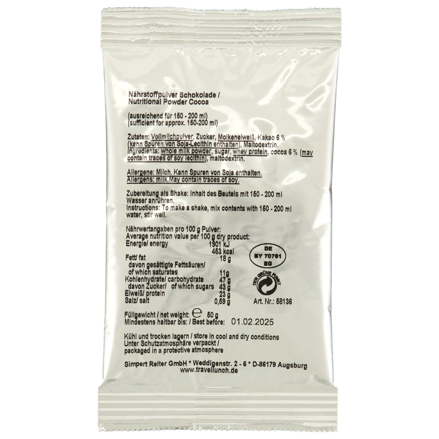 Das Nährstoffpulver Schokolade ergibt, vermengt mit ca. 150 – 200 ml Wasser, einen leckeren Schokodrink, welcher obendrein für ordentlich Energie und Eiweißzufuhr sorgt. Dank der Großpackung ist man für große Touren oder das Training optimal ausgestattet.