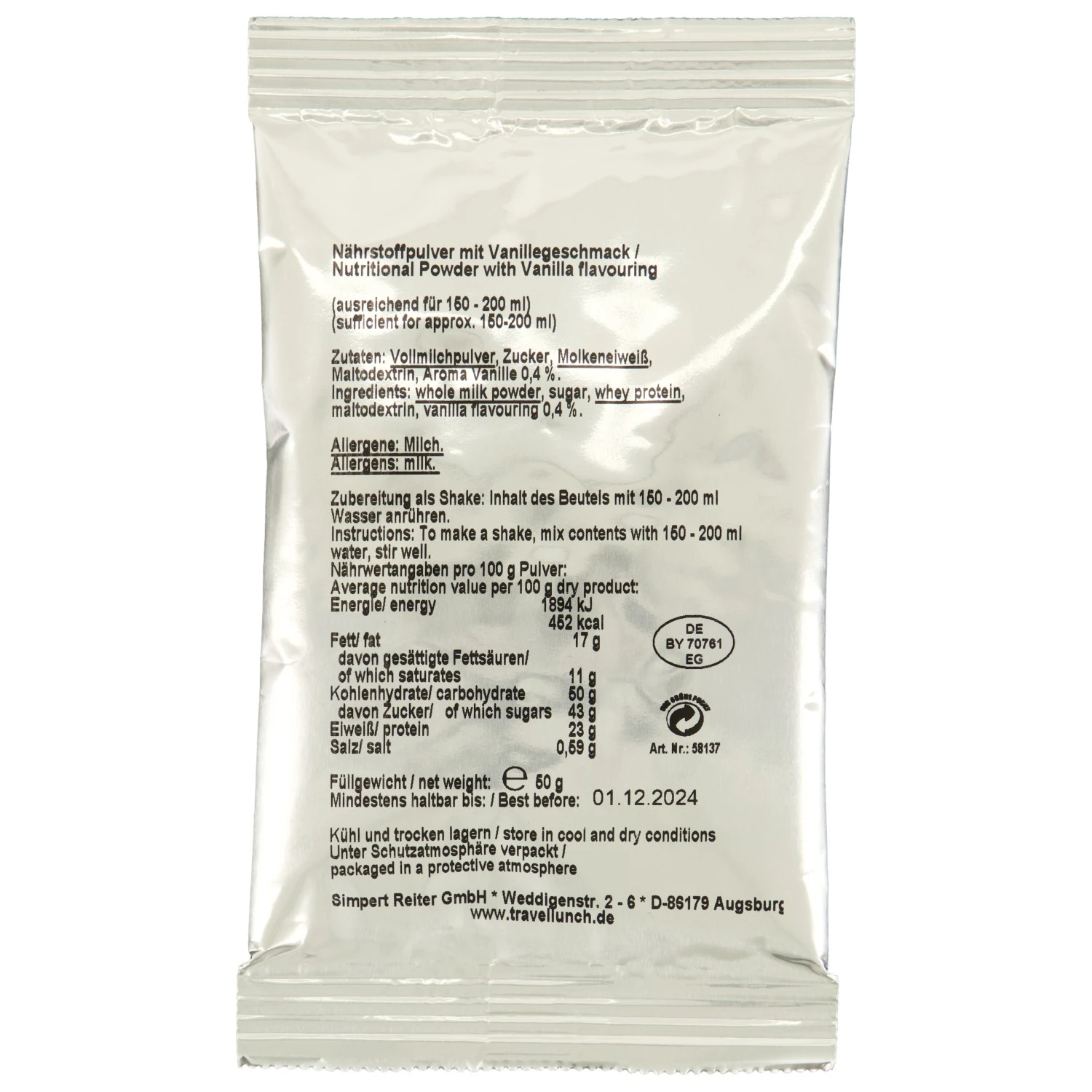 Das Nähstoffpulver Vanille von Travellunch versorgt den Körper mit Energie und Eiweiß. Daher ist der Drink ideal für das Traning oder nach dem Sport geeignet. Der Inhalt des Beutels wird mit ca. 150 – 200 ml Wasser verrührt und kann direkt im Anschluss getrunken werden. Im Paket sind 15 Beutel vorhanden.