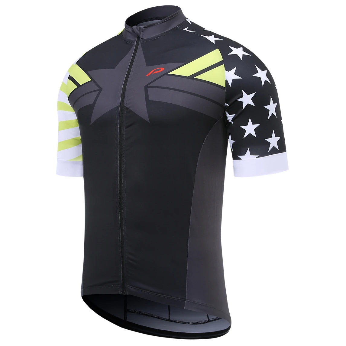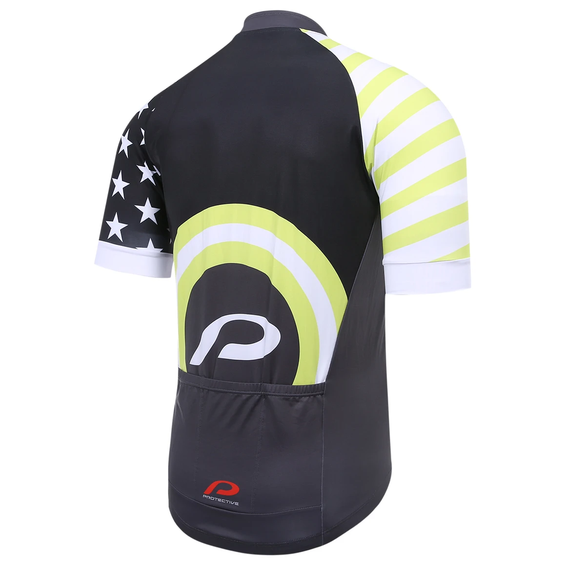 Stars and Stripes prägen das Design des P-Meteor Radtrikots von Protective. Das sportliche Radtrikot ist körpernah geschnitten und mit einem durchgehenden Frontreißverschluss ausgestattet. In der dreiteiligen Rückentasche lassen sich alle wichtigen Accessoires verstauen, die beim Radfahren schnell zur Hand sein müssen. Die funktionelle Materialmischung aus recyceltem Polyester und Elasthan sitzt mit dem silikonisierten Saumabschluss sicher und bequem.