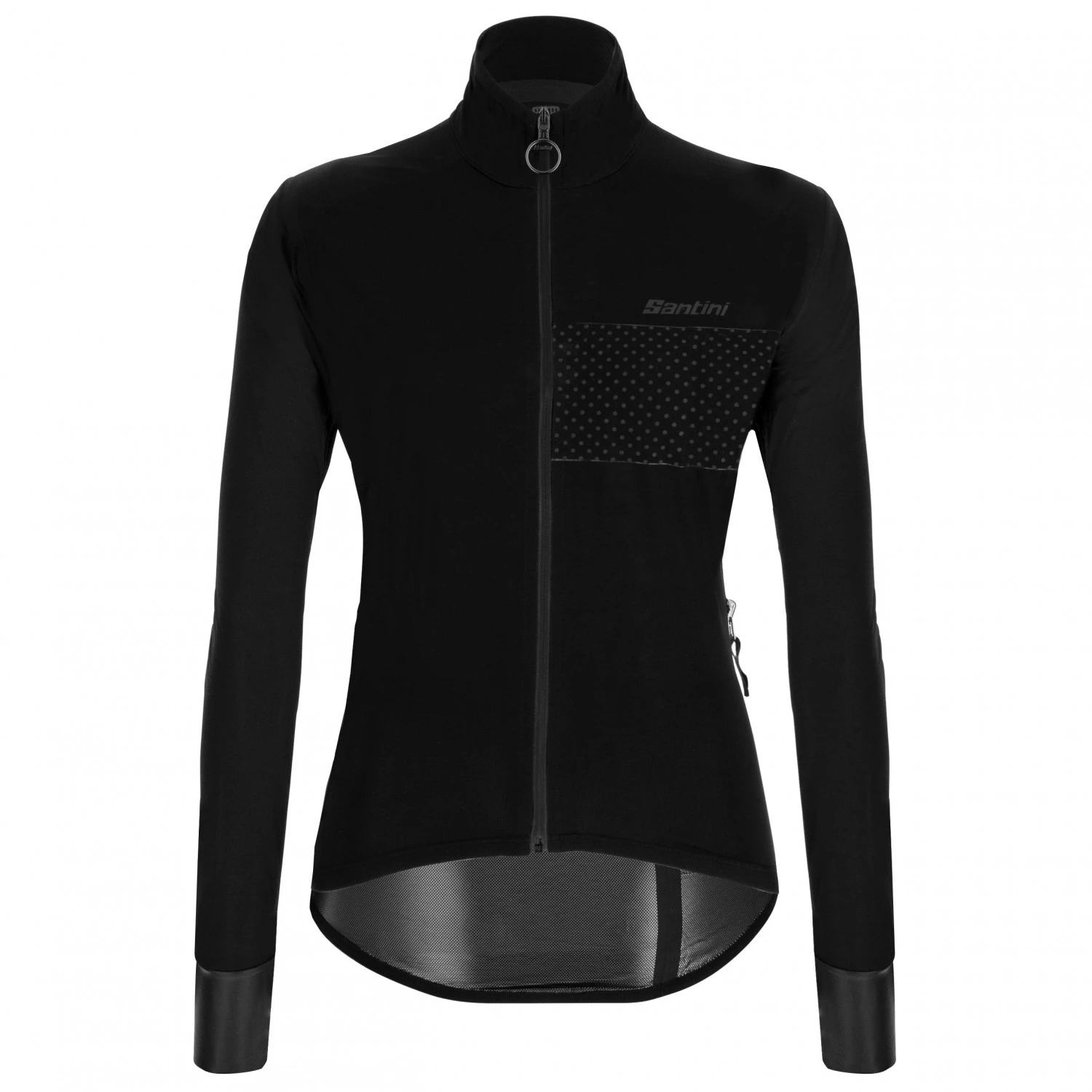 Die Women’s Guard Nimbus Jacket Fahrradjacke von Santini träg sich bequem über einem Radtrikot. Mit ihrem doppellagigen Grimpeur Gewebe schützt sie beim Radfahren zuverlässig vor Regen, Wind und Wetter. Das ultraleichte Gewebe ist dabei nicht nur wasserdicht, sondern auch sehr atmungsaktiv und hochelastisch. So überzeugt die Women’s Guard Nimbus Jacket bei kurzen Sommerregen ebenso gut, wie bei windigem Wetter und wechselhafter Witterung. Da sich die Santini Jacke auf kleinstem Raum packen lässt, passt sie sogar mühelos in die Rückentasche des Fahrradtrikots. Die wasserdichte Tasche an der Seite dient dabei gleichzeitig als praktische Packtasche und macht die Jacke zum optimalen Wahl für tägliches Radtraining.