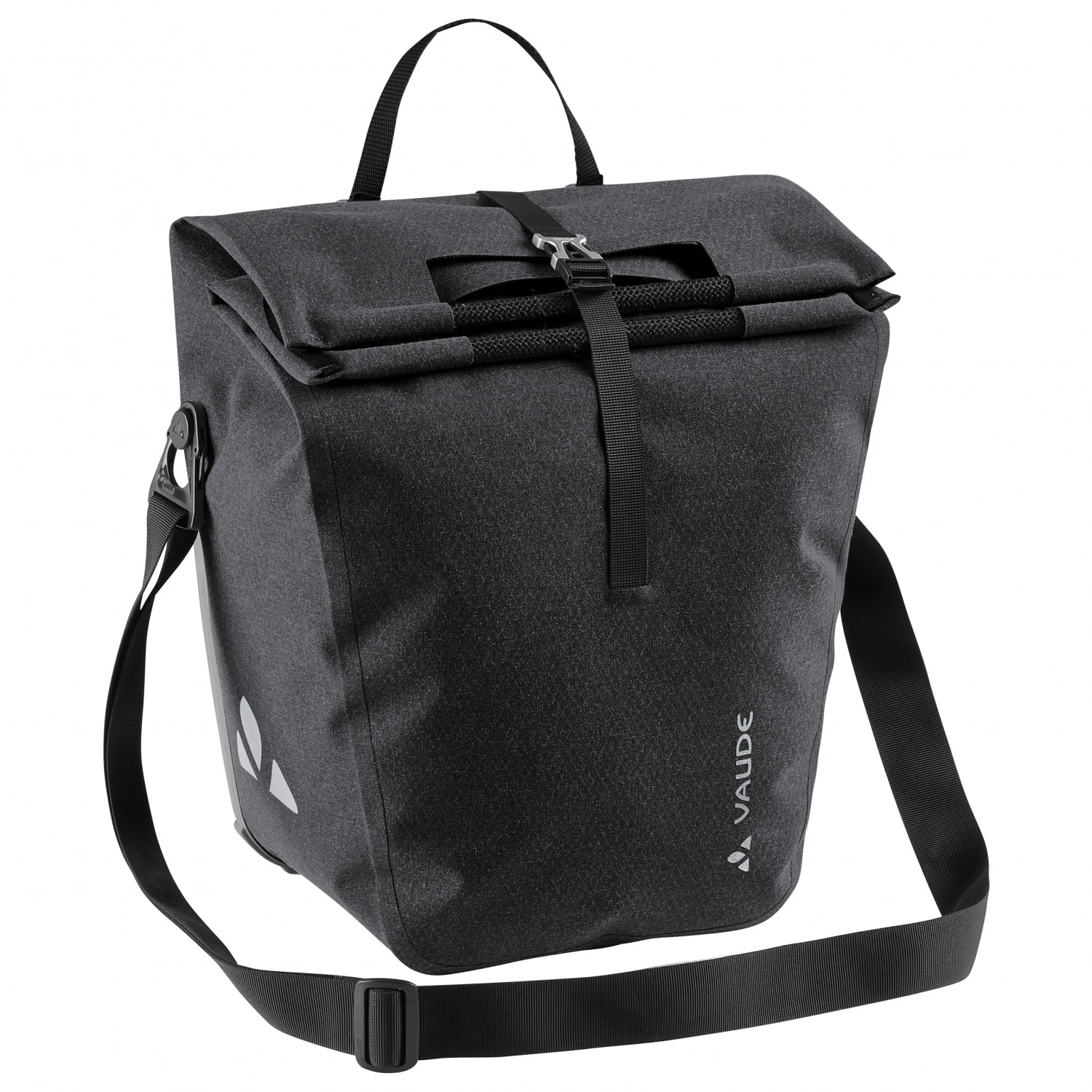 Die ReCycle Back Single 30 ist mit einem Hartschalen-Taschenrücken ausgestattet, der der Tasche eine hohe Stabilität verleiht. Außerdem lässt sie sich mithilfe der integrierten Schnellbefestigungshaken QMR 2.0 leicht vom Gepäckträger lösen, aber auch direkt mit einem Schloss (nicht im Lieferumfang enthalten!) am Fahrrad absperren. Mithilfe des abnehmbaren, verstellbaren Schultergurtes kannst Du die Tasche überall mit hintragen. Dabei verhindert die rotierende Befestigung des Gurtes ein Abkippen. Egal ob auf dem Weg zur Arbeit, zum Einkaufen oder auch zum Picknick – die ReCycle Back Single 30 von Vaude bietet viel zusätzlichen Stauraum am Fahrrad. Das robuste und wasserdichte Außenmaterial schützt den Tascheninhalt zuverlässig vor Regen und Spritzwasser. Der praktische Rollverschluss bietet einerseits zusätzlichen Wasserschutz und andererseits erweiterbaren Stauraum.